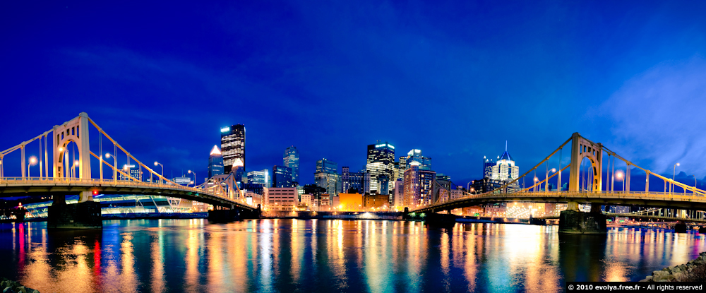 Notre route passait ensuite par Pittsburgh où nous avons eu le plaisir de voir Stéphanie – une amie qui vit aujourd’hui expatriée aux Etats Unis – et qui travail comme fille au paire chez le directeur du premier journal de Pittsburgh :) Histoire d’en profiter, on est allé prendre un verre et grignoter dans un restau super sympa qui se trouve au pied du fleuve Ohio, juste avant une session de photo nocturne dans la ville.