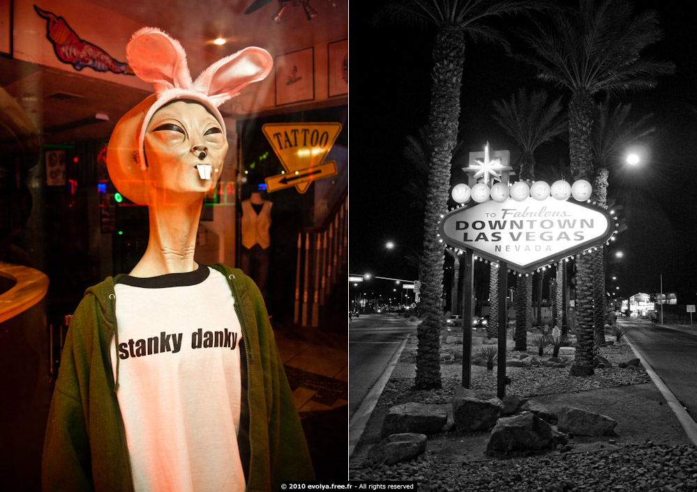 Quand nous avons visité Las Vegas (un jeudi) nous avons découvert une ville déserte, avec quelques touristes par-ci par-là et surtout des clodos, mais pas de grosses limousines ni de vagues de visiteurs venu dépenser des mois de salaires aux machines à sous. D’après le chauffeur de taxi que nous avons emprunté, la ville ne se porte pas aussi bien que pourrai nous faire croire les enseignes étincelantes des casinos surdimensionnés. Le nombre de visiteur serait en déclin depuis quelques années, probablement à cause de la crise économie ou peut-être que l’idée de venir perdre ses sous aux machines ne fait plus recette. Il n’empêche que la cité connait de profondes difficultés que ce soit d’un point de vu écologique (la ville – construite en plein désert – importe des quantités pharaoniques d’eau des sources voisines) et économique. La ville doit aussi faire face à une importante population de mendiants (que la police déplace chaque soir du centre ville vers les Downtown) qui contraste avec le luxe des millionnaires et leurs grosses berlines.