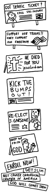 Sur la route vous rencontrerez une quantité importante de panneaux amusant, comme « speed checked by aircraft » ou encore « adopt an highway » (des bénévoles qui assurent la propreté d'un segment de l'autoroute et qui n'hésiterons à vous balancer aux flics en cas d’infraction) qui sont assez divertissant. Par contre, certaines bornes réfléchissantes qui bordent les routes ressemblent à s’y méprendre à des cigarettes (rectangle blanc avec une partie brillante jaune sur le dessus) ce qui est assez agaçant au bout de 6 heures de route :)