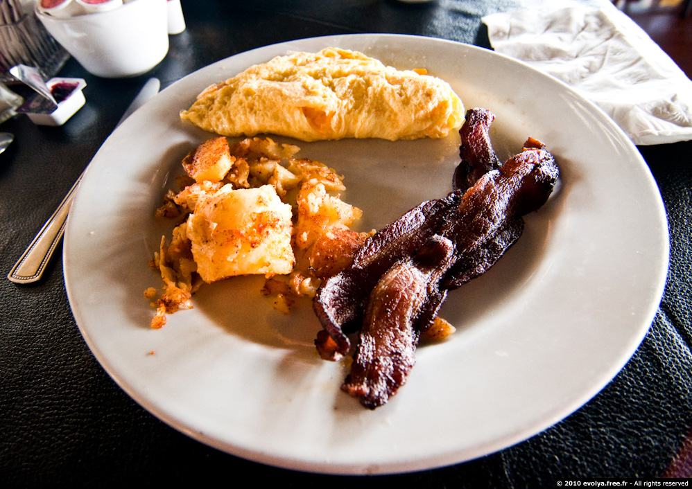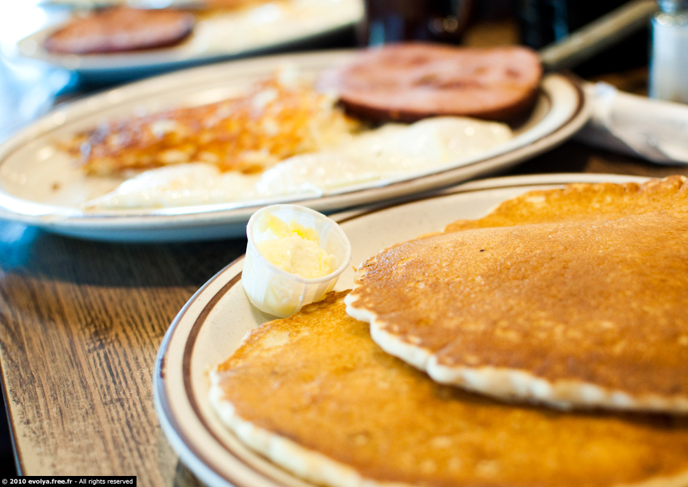 au super breakfast. Oeufs au plat, bacon grillé, pancake au sirop d’érable, pommes de terre et toast