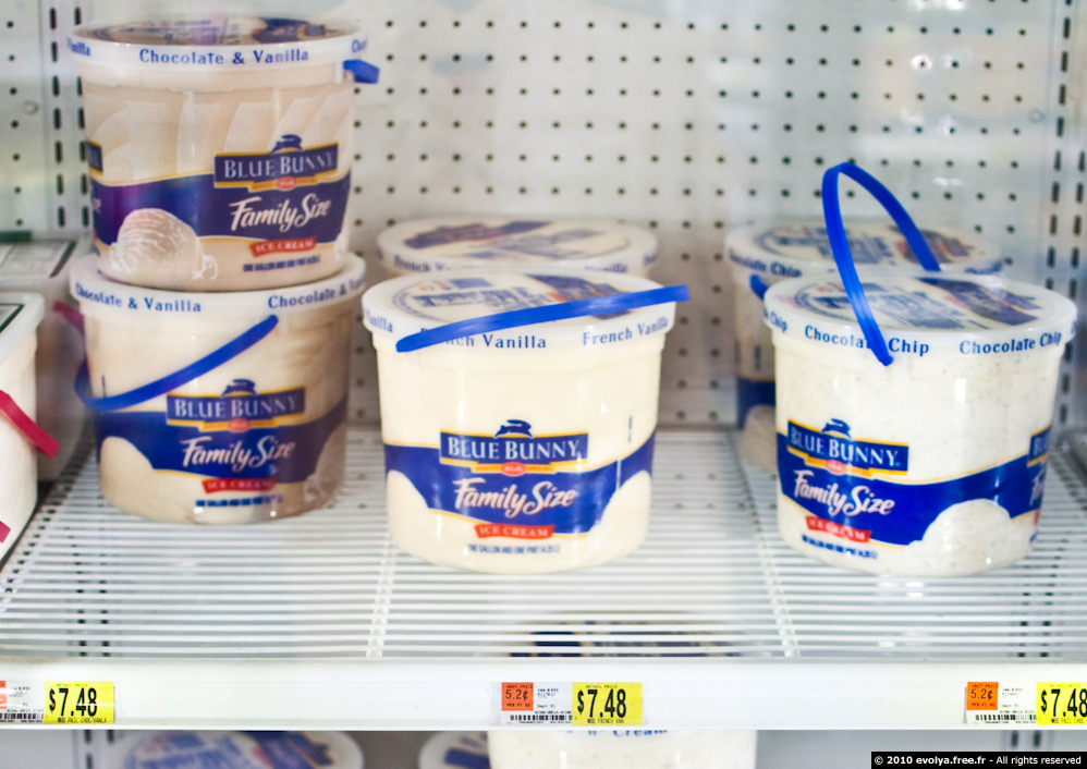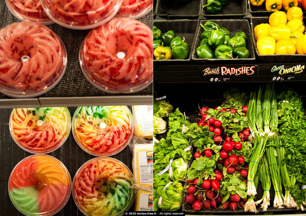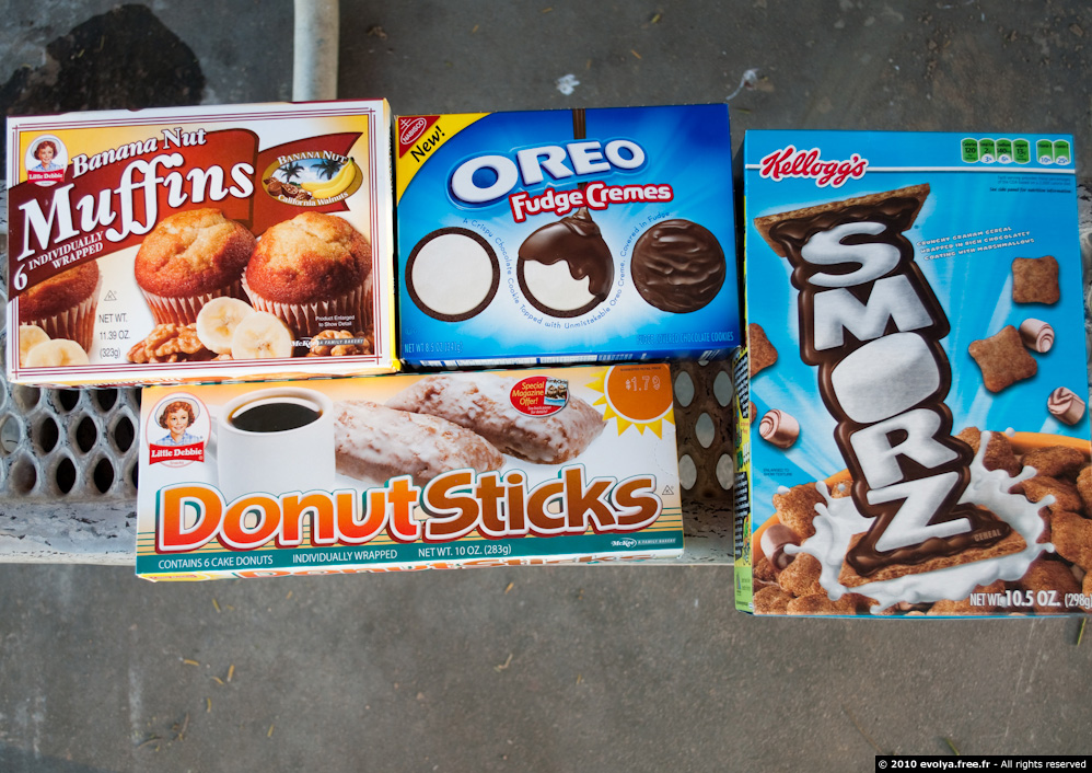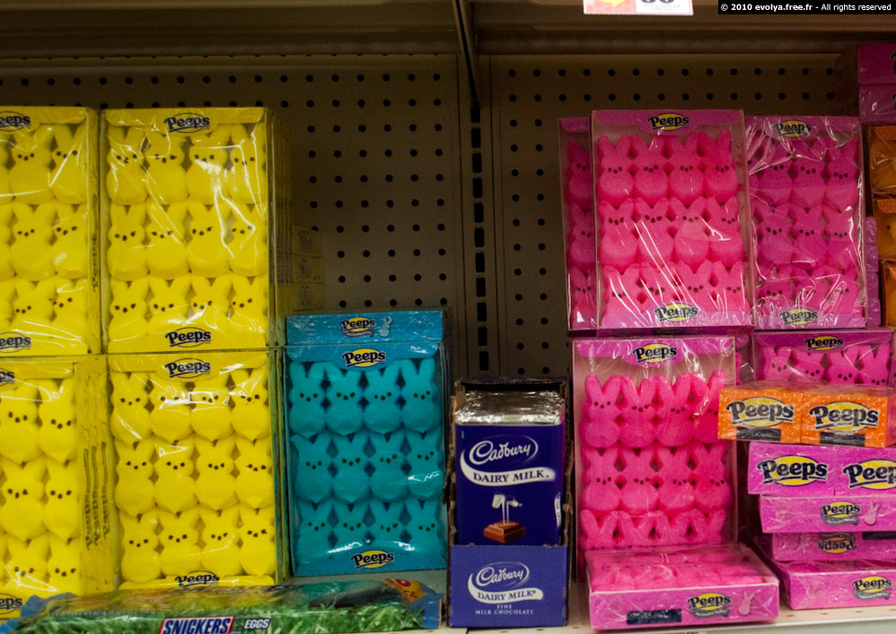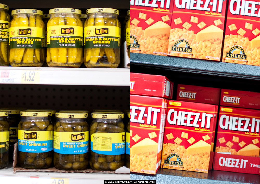 Concrètement, les Américains ont 20 ans d’avance sur nous concernant la nourriture : donuts fourrés à la crème pâtissière, céréales aux marshmallow, muffins remplis de crème chantilly, crème de marshmallow, bretzel sucrés enrobés d’un superbe glaçage, bonbons en formes de petits poussins entièrement en sucre, crèmes glacés nappées de sauces caramel ou cerise, fromage à tremper dans sa barquette de beurre de cacahuète, sodas énergisant multicolores, milk-shake pétillants à la pèche... que du bonheur pour devenir gros :)
